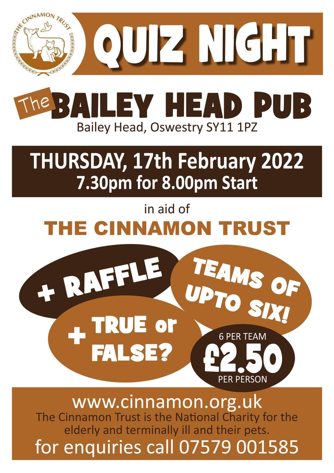 Our next charity quiz is on Thursday, 17 February in aid of the Cinnamon Trust, the national charity for the elderly, terminally ill, and their pets. 7.30pm for 8pm start. … Read moreCharity Quiz – Thursday 17 February
