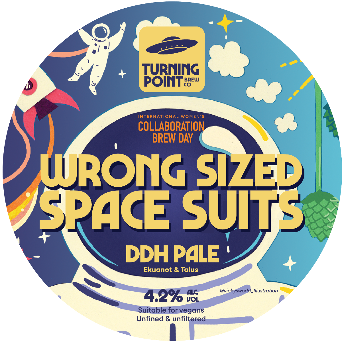 “Wrong Sized Space Suits” from Turning Point is a 4.2% DDH Pale with Talus and Ekuanot in cask, and the result of 67 pairs of women’s hands working together. Why the name? Wrong Sized Spacesuit refers to when NASA had to cancel their first all female spacewalk as they didn’t have enough Spacesuits for women (2) to go ahead!
